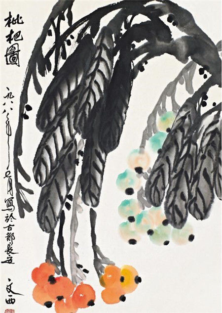 题识:枇杷图。一九八八年七月写于古都长安,文西。钤印:刘文西